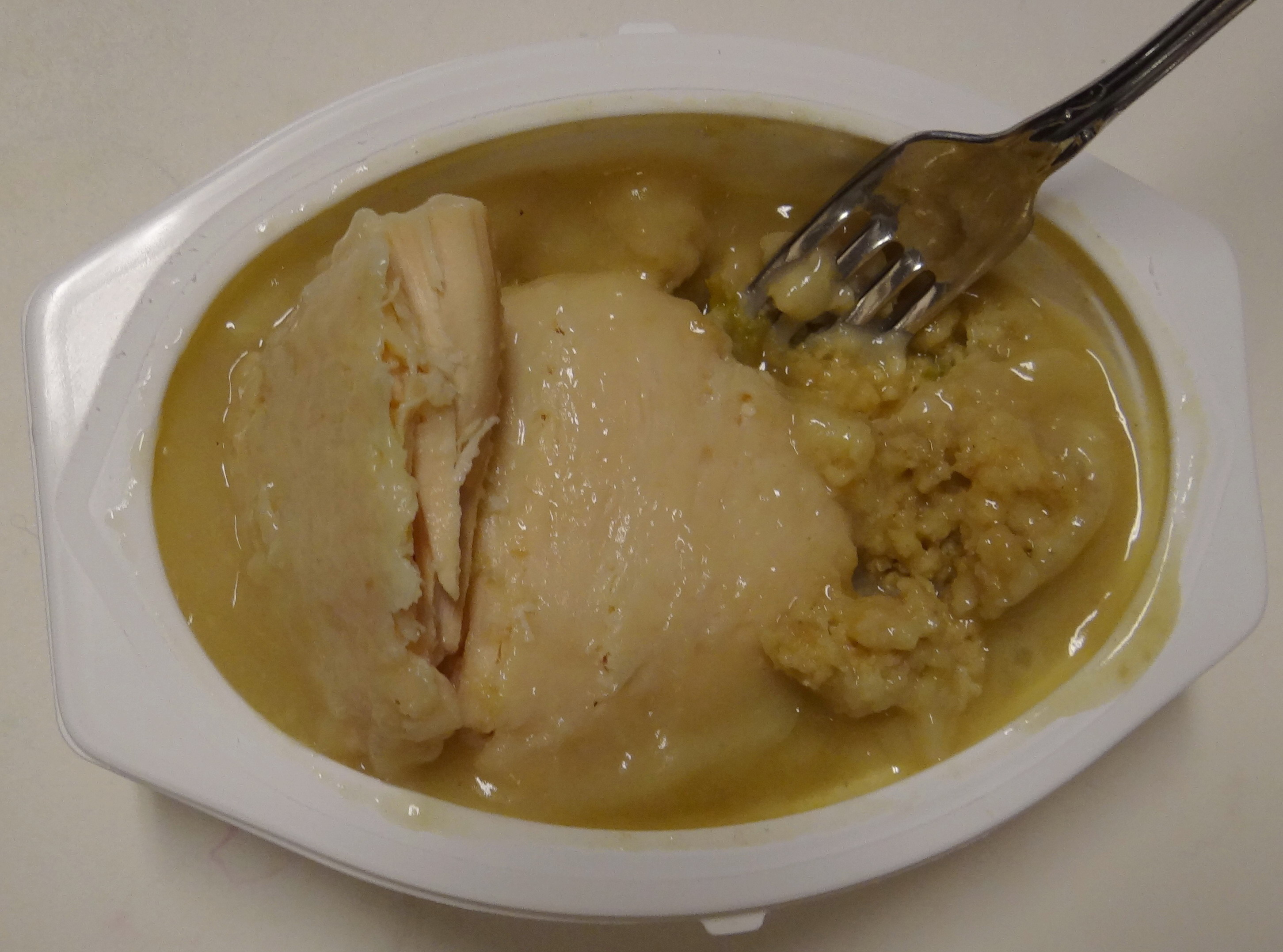 There is a thick piece of tender chicken breast that was as big as the container. The gravy, as has been the gravy in most Hormel Meals that I have tasted so far, was thick and savory. The stuffing reminded me of that "famous brand" of stuffing you do on the stove. You could taste the subtle flavor of herbs and spices in the stuffing which was more of a "wet" stuffing. Carol mentioned that it had a "processed" taste to it and didn't like. Come to think of it I noticed that too, something that neither of us noticed with the Turkey & Stuffing Hormel Meal.