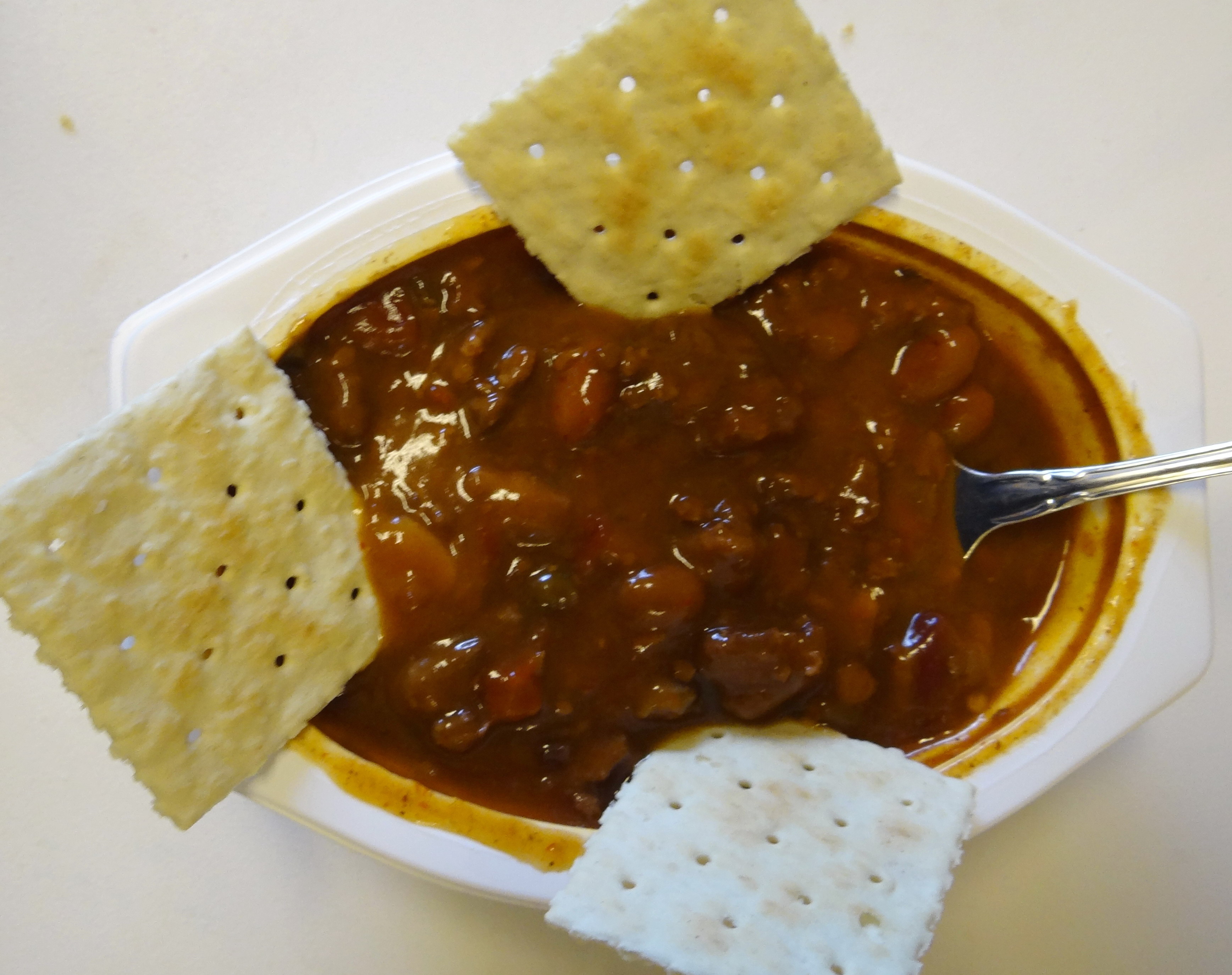 So the first thing you do do a good bowl of chili is break up a few crackers into it. I found that four crackers was the number for me. The sauce is hearty with just a hint of heat. It's not really mild in my opinion but not quite medium either. Perhaps its somewhere in a good in between. The package didn't say anything about ground beef in it but I could swear that there was some ground beef in the recipie. If not Hormel somehow gave me that impression.