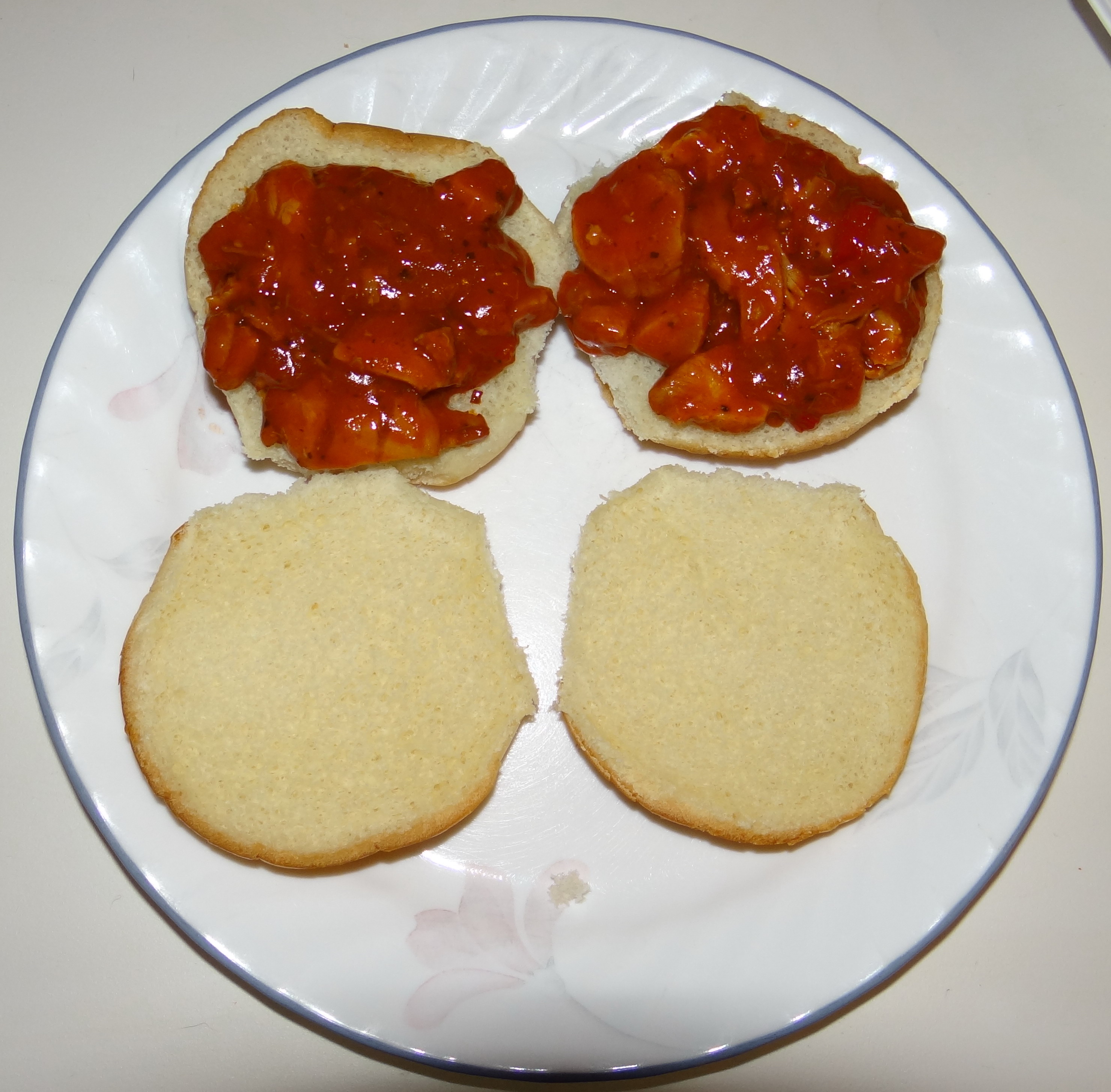 I choose to use every day hamburger buns. We cooked two packages for the two of us. With great anticipation, I pulled the plastic film off of the containers. It looked great and ready to eat. We were able to get two sandwiches out of each package and of course you have to spoon some of the marinara in your roll too.