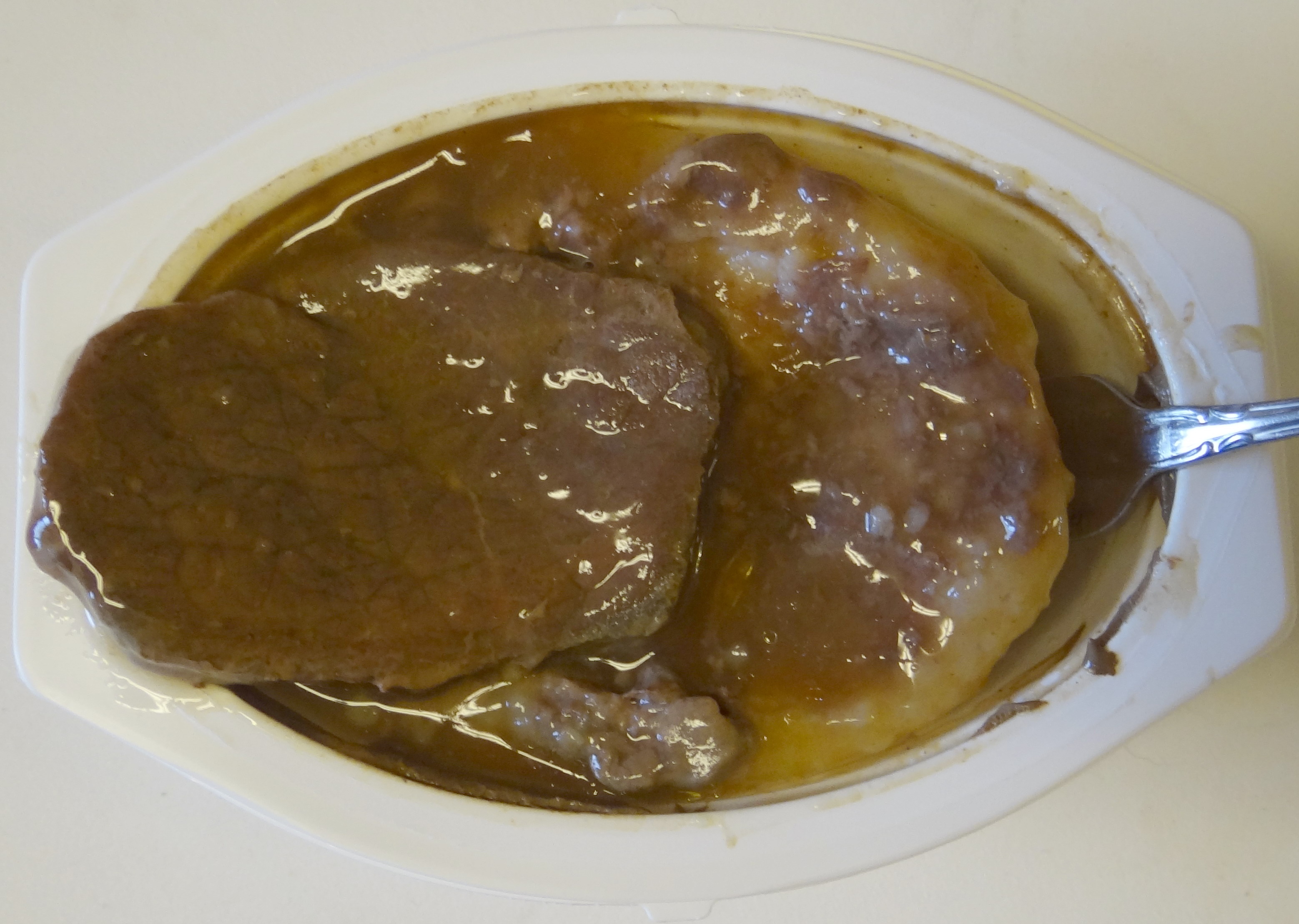 The gravy is a little weak on this one, the beef is tender but coarse and the potatoe part (as with all the mashed potato entrees) falls a short. The mashed portion of this meal is a bit on the stiff side and a bit bland, however, coat them well with gravy and they become somewhat tasty if not a bit thick & pasty.