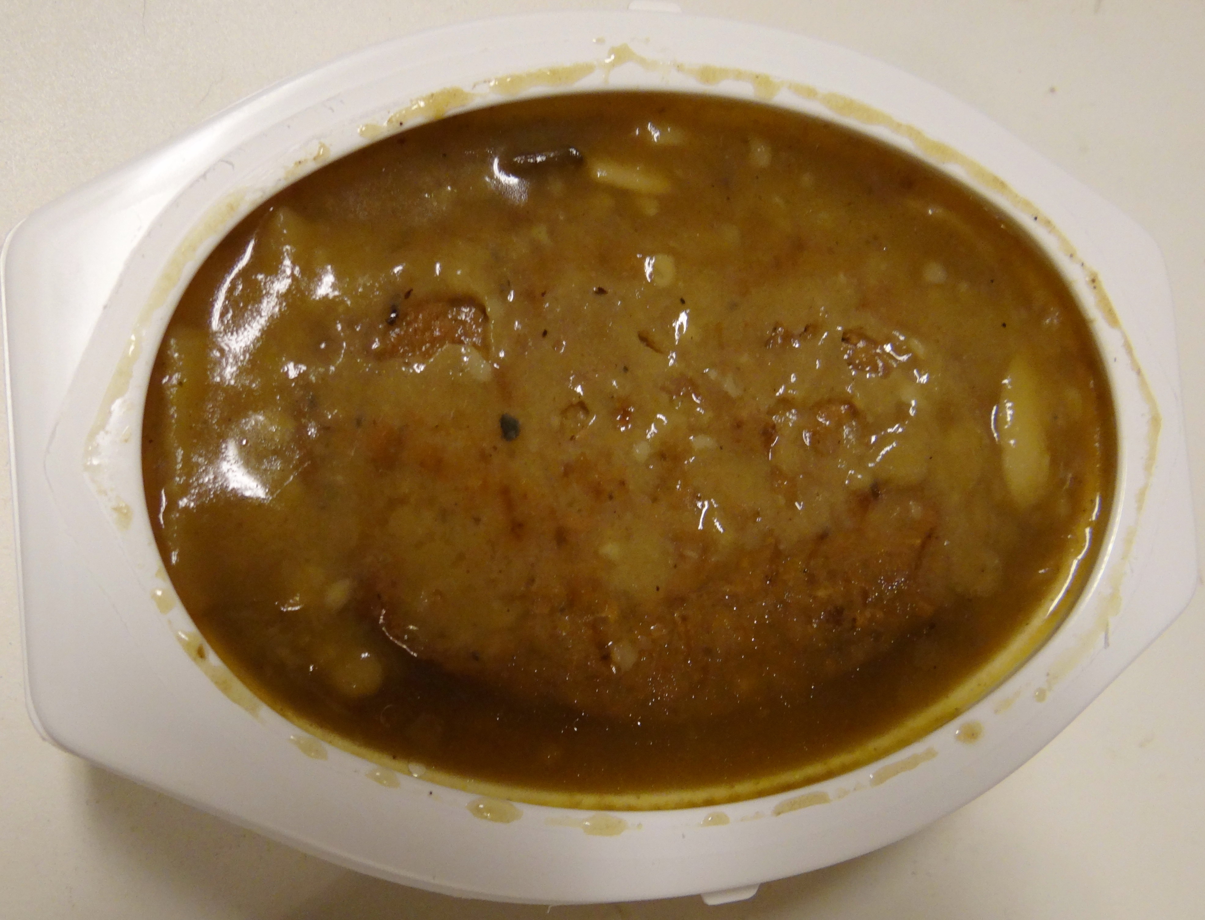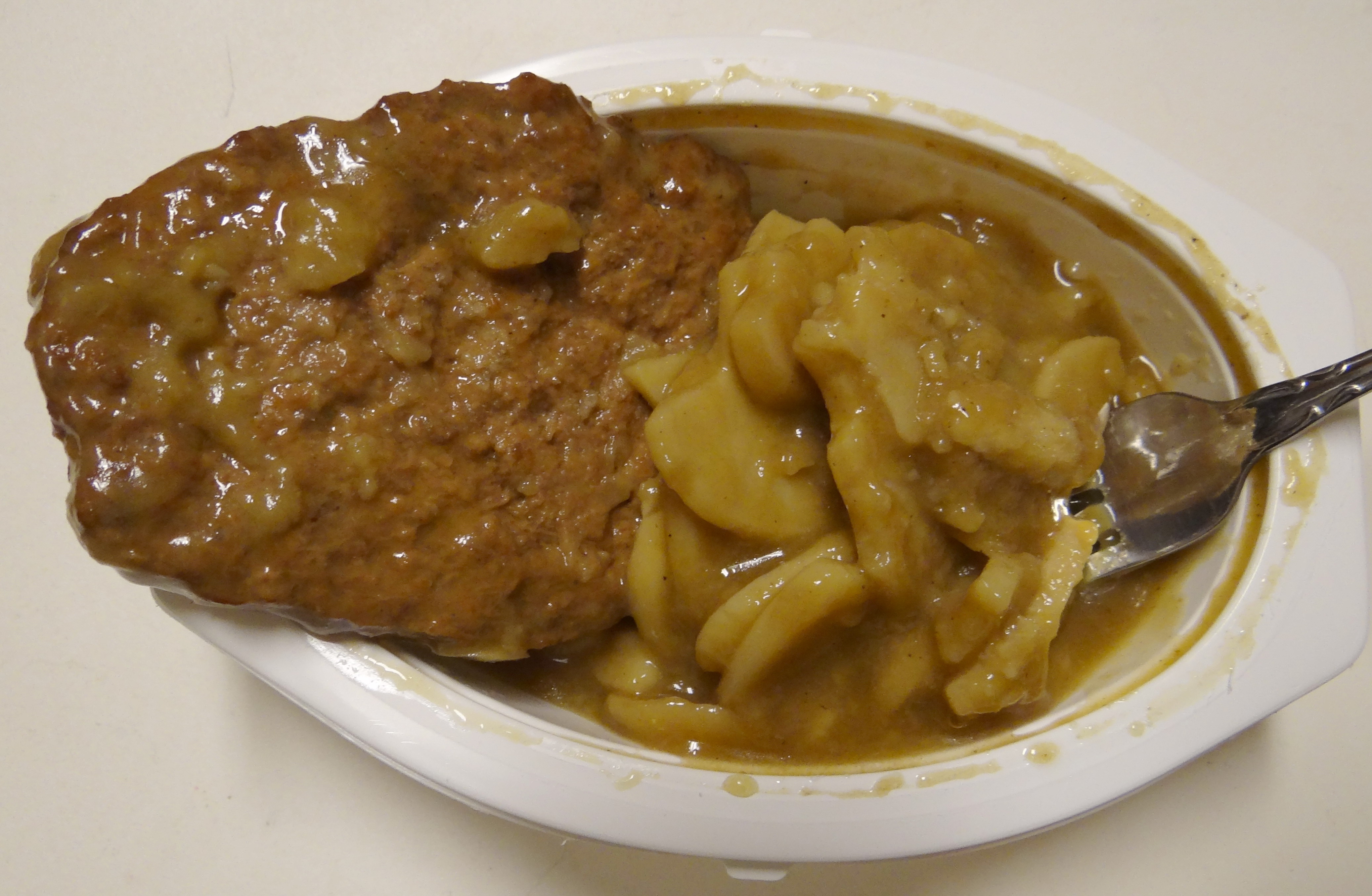 The Salisbury Steak was one large portion that was as big as the container and nearly 1/2" thick. The "steak" had a good taste and wasn't full of filler. The potatoes were nice sized and had a good consistancy and the gravy, well as with most of not all of the Hormel Meals with gravy, thick and savory.