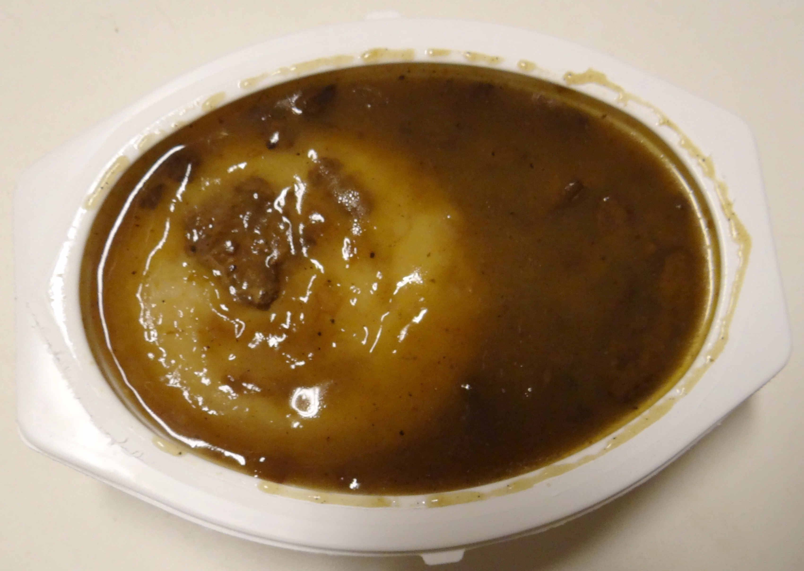 The gravy is hearty, the tips are tender and bite sized but the potato part falls a bit short. The mashed portion of this meal is a bit on the stiff side and a bit bland, however, coat them well with gravy and they become tasty if not a bit pasty.