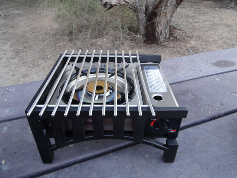 Finally I figured it out, this product would help the wind from knocking out the stove flame, the 12x12 grill bars on top would make a very stable platform for large and heavy pots and pans and it got the stove up off the cooking table. Of course it was something needed in my camp kitchen. Besides, I could cook toast or toast rolls on the grill part, a 12x12 or similar size griddle could be gotten for it and there were some neat accessories available for it such as a cutting board, spice rack and tong holder.